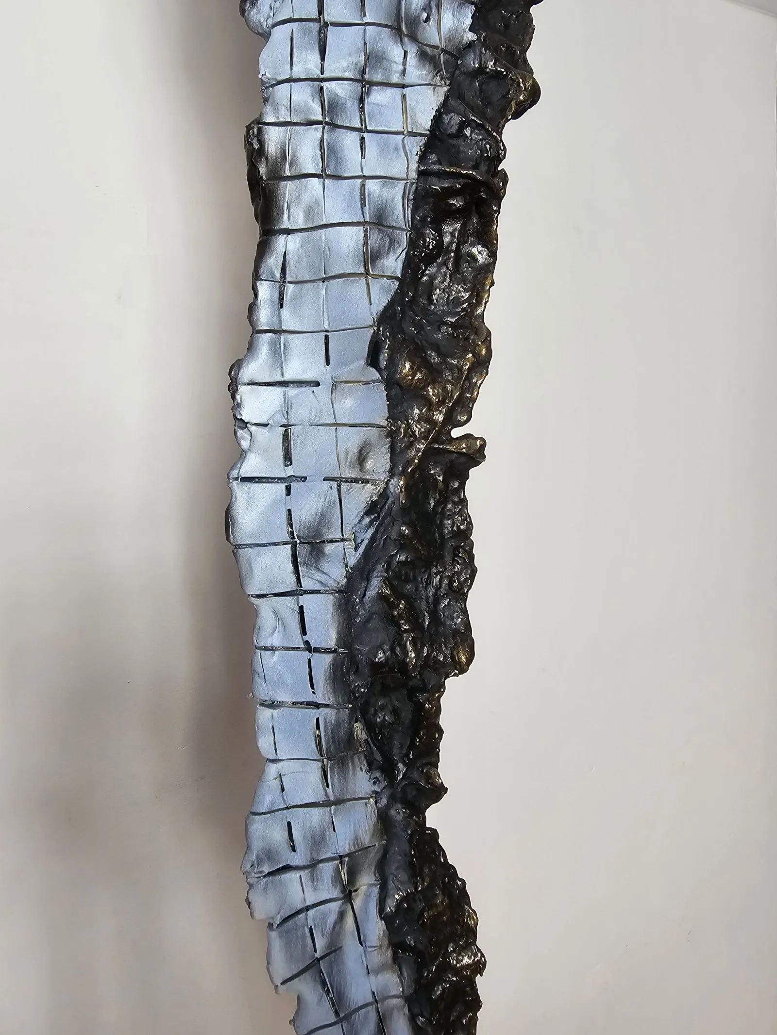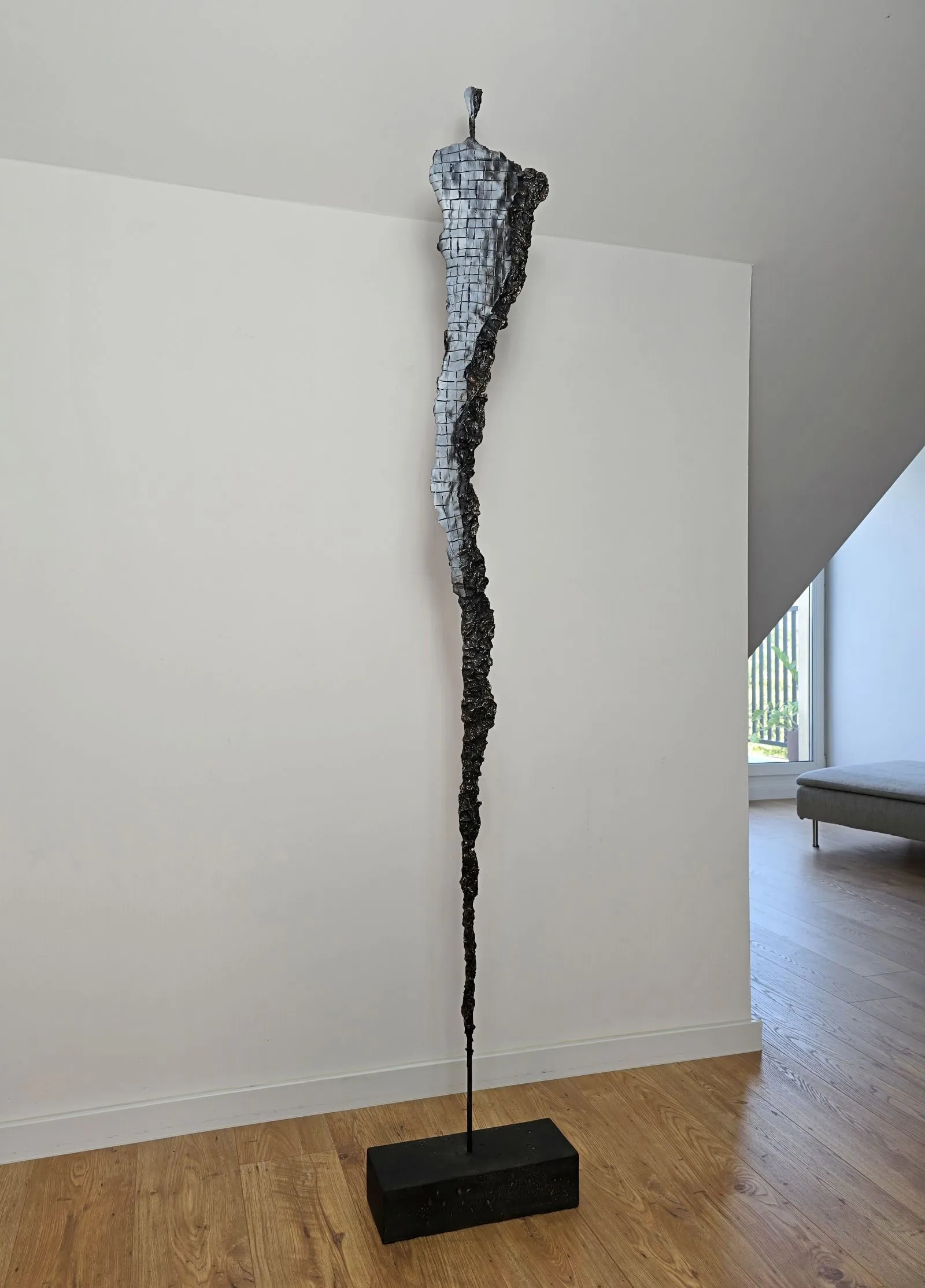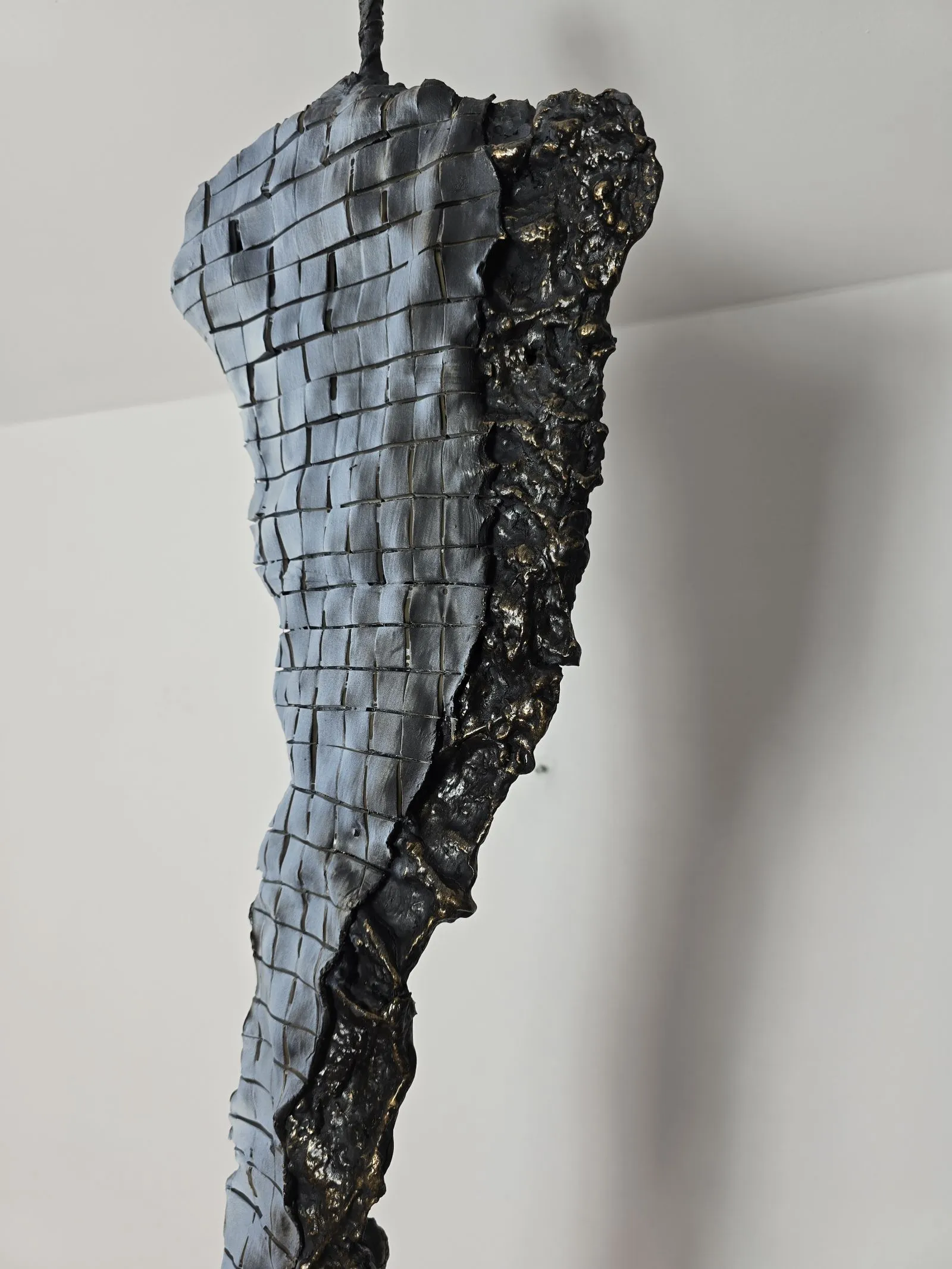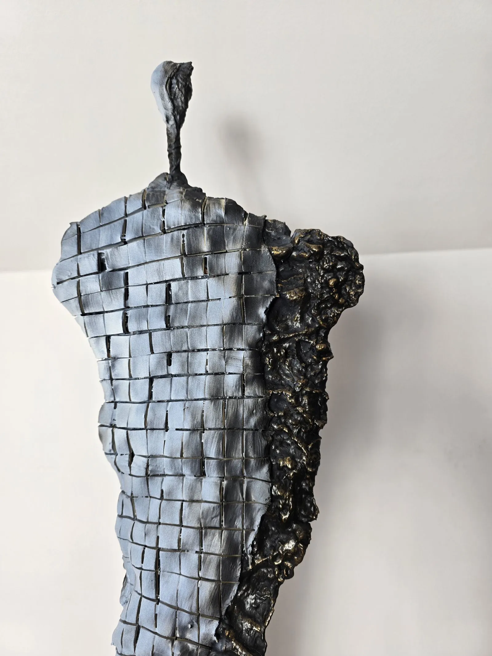 Rzeźba przedstawiająca ludzką postać, wykonana z metalu, gliny i betonu, to fascynujące dzieło łączące w sobie piękno niedoskonałej formy i subtelnie przebijające z niej emocje. Postać spleciona z gliny i skomplikowanej siatki nieregularnych linii, które przywodzą na myśl korzenie, gałęzie drzew, są jak tętniący życiem emocjonalny krwiobieg rzeźby. Te linie, niczym żywe nerwy, oplatają postać, tworząc dynamiczną i poruszającą teksturę, angażując widza w intymny dialog z materią.