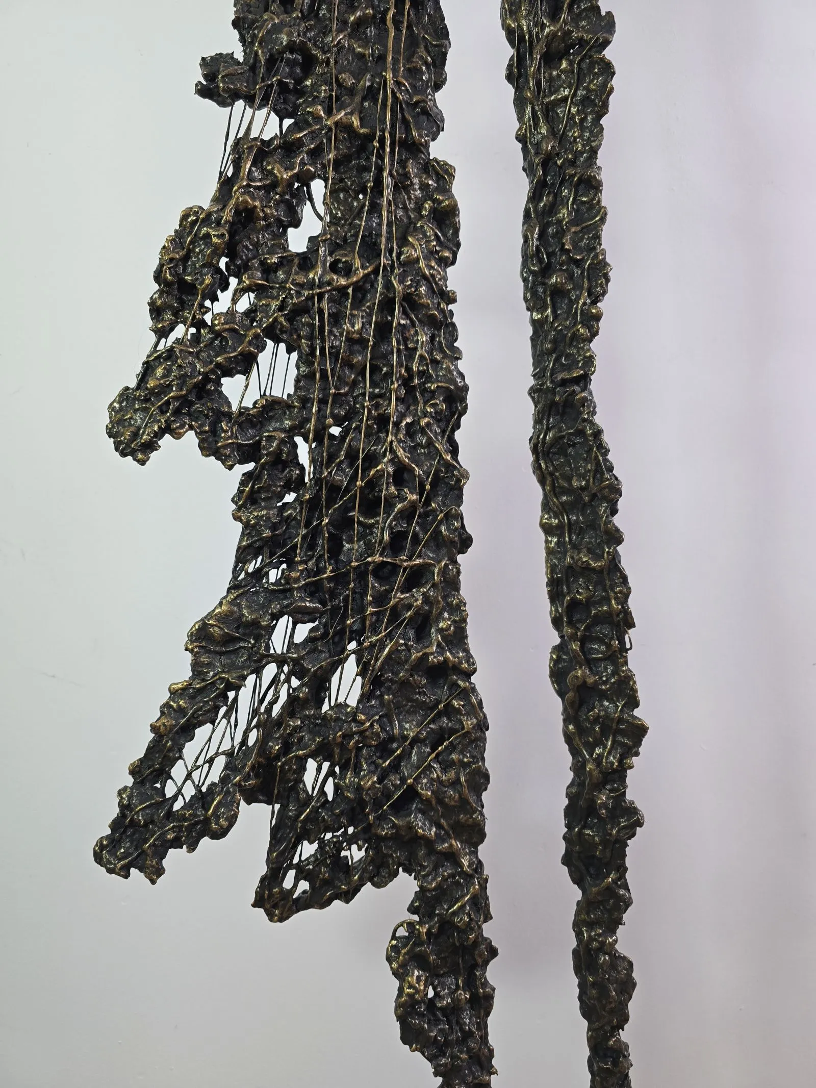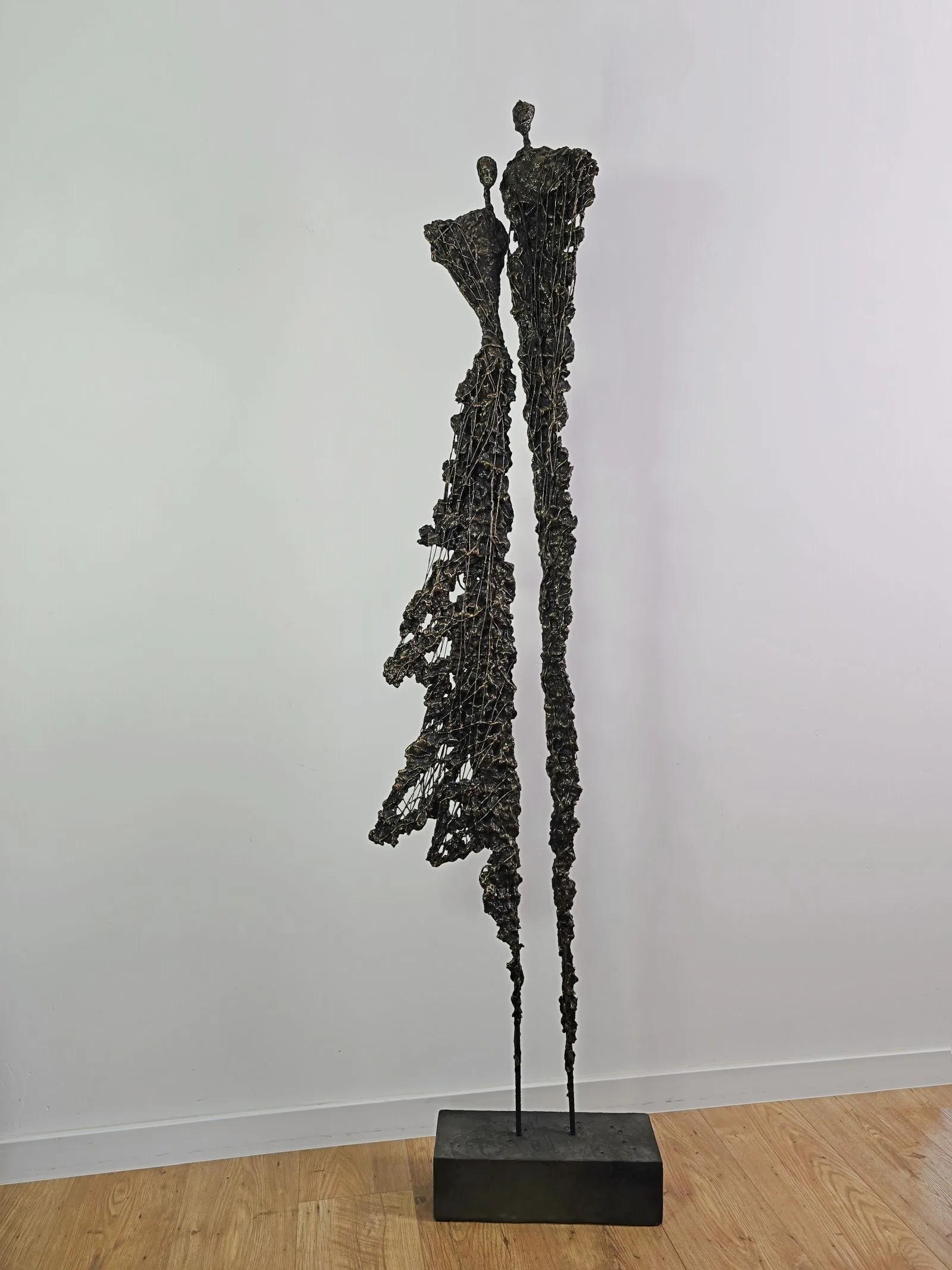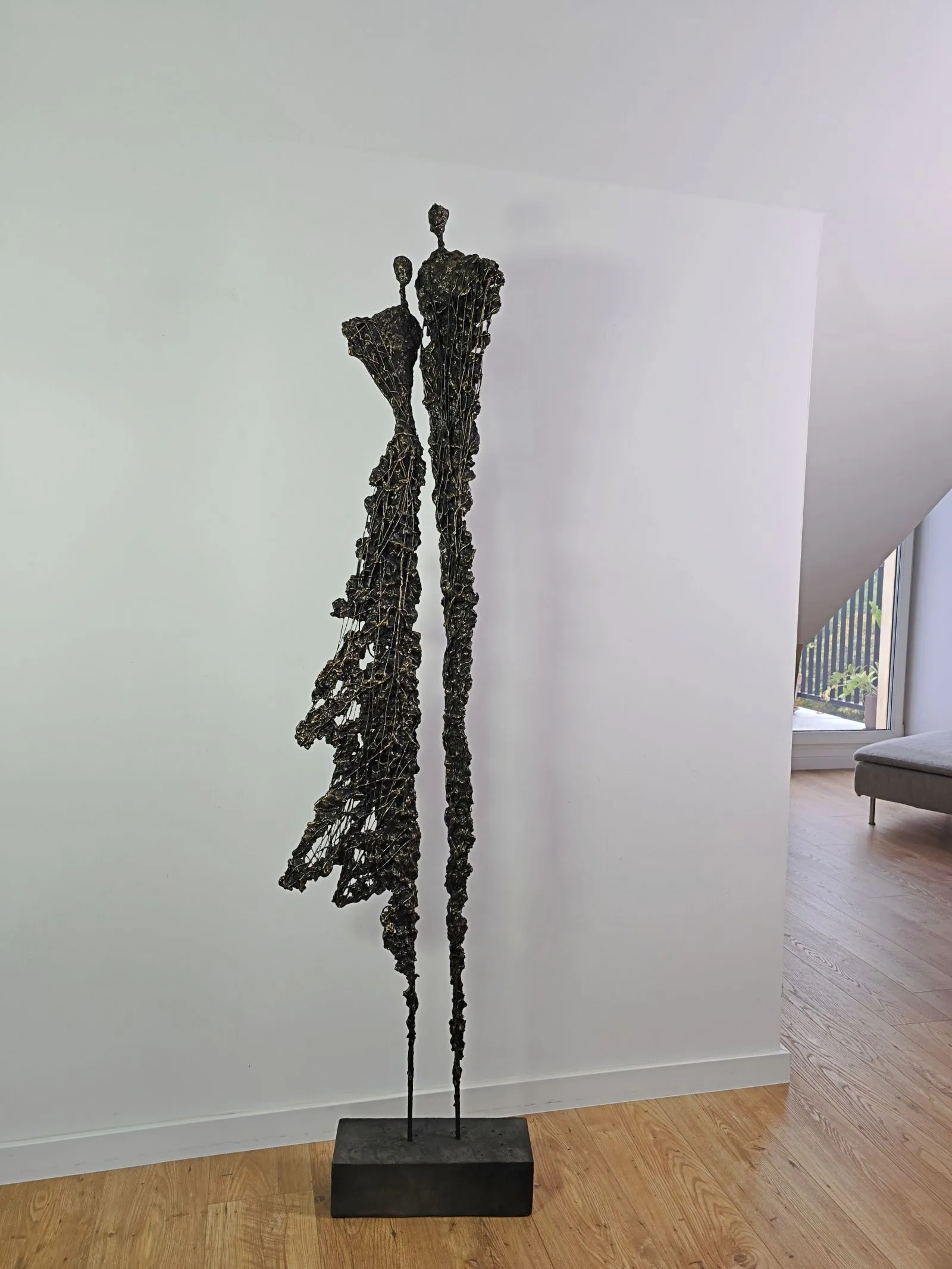 Rzeźba ta emanuje subtelną gracją i abstrakcyjną poetyką, łącząc surowość metalu z organicznością gliny. Wysoka, filigranowa forma zdaje się balansować na granicy między materialnością a ulotnością, jakby postacie były tylko cieniami utkanymi z delikatnych nici metalu. Ażurowa struktura przywodzi na myśl proces dezintegracji i odnowy, w którym fragmenty przekształcają się w nową, harmonijną całość. To wyraz subtelnego dialogu między trwałością a efemerycznym pięknem, w którym rzeźba ożywa w przestrzeni.