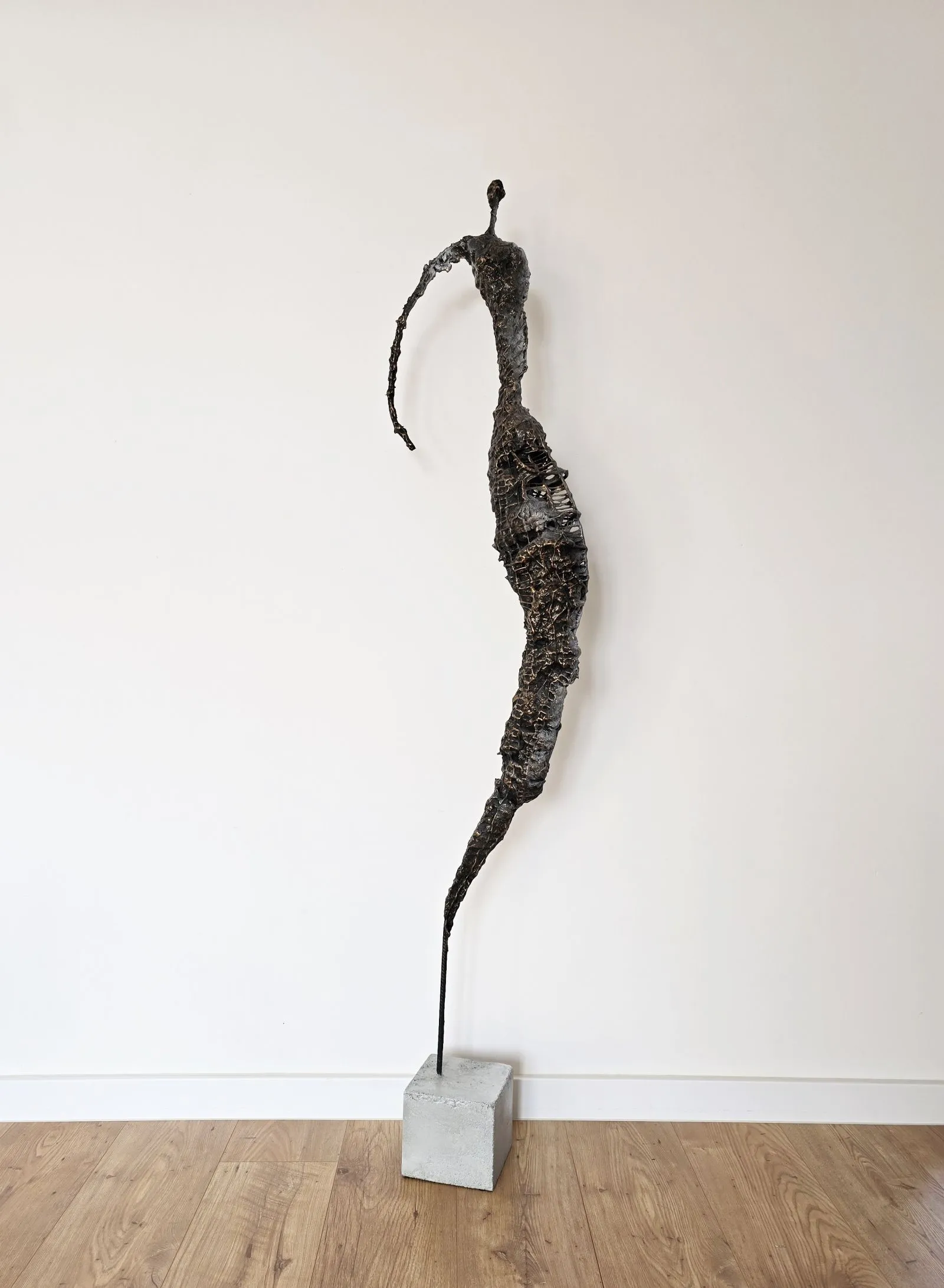 Inspiracją dla tego wyjątkowej rzeźby są obrazy i grafiki z mojej kolekcji Point od Balance. Zaczerpnięty z nich motyw kamiennych postaci, przeniesiony do formy przestrzennej, dodając rzeźbie głębi i znaczenia. Biomorficzne kształty rzeźby, nawiązujące do ludzkich sylwetek, wyrażają emocje i relacje, jakie łączą nas z innymi. Surowość materiałów została złagodzona przez plastyczność gliny i masy z sproszkowanego kamienia, tworząc harmonijną całość.