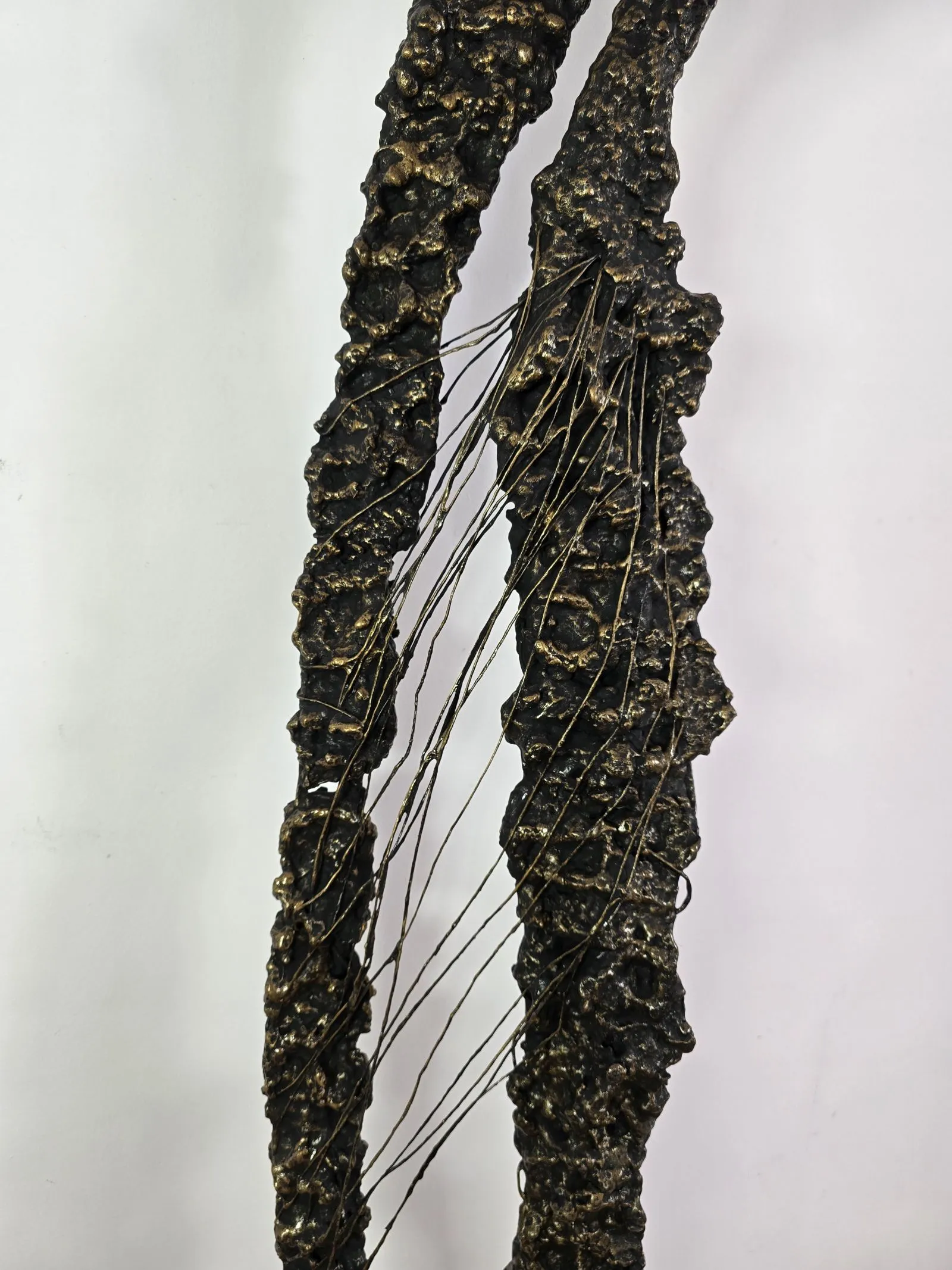 Rzeźba przedstawiająca ludzką postać, wykonana z metalu, gliny i betonu, to fascynujące dzieło łączące w sobie piękno niedoskonałej formy i subtelnie przebijające z niej emocje. Postać spleciona z gliny i skomplikowanej siatki nieregularnych linii, które przywodzą na myśl korzenie, gałęzie drzew, są jak tętniący życiem emocjonalny krwiobieg rzeźby. Te linie, niczym żywe nerwy, oplatają postać, tworząc dynamiczną i poruszającą teksturę, angażując widza w intymny dialog z materią.