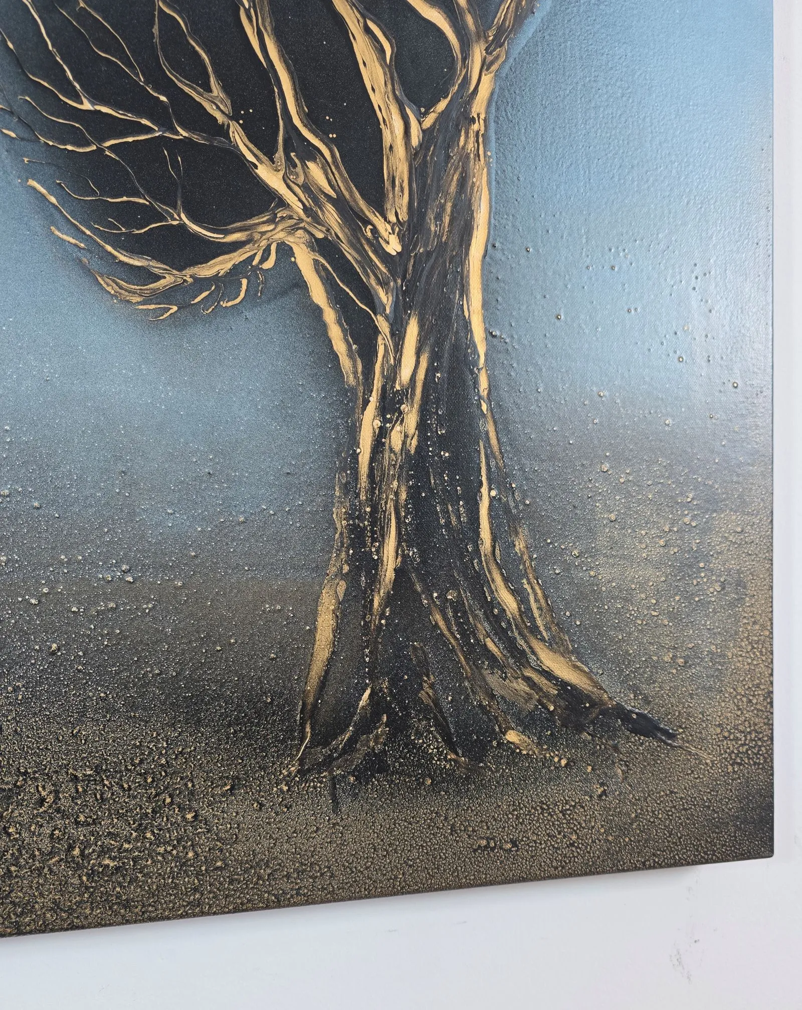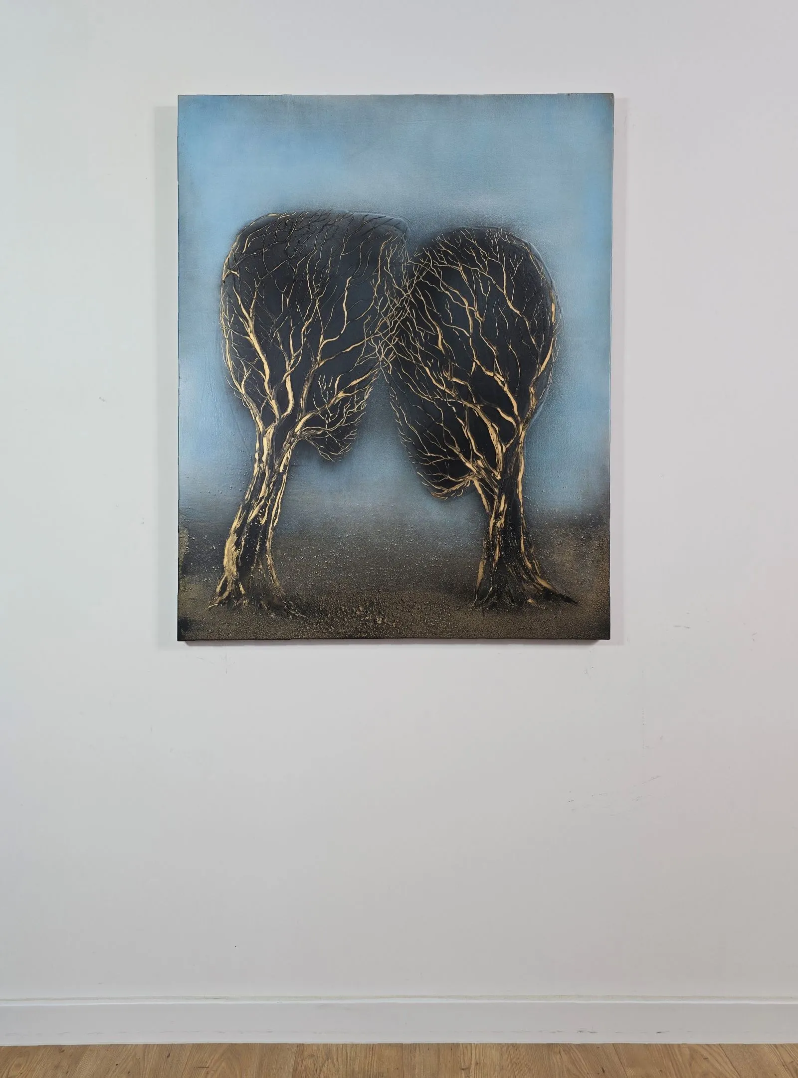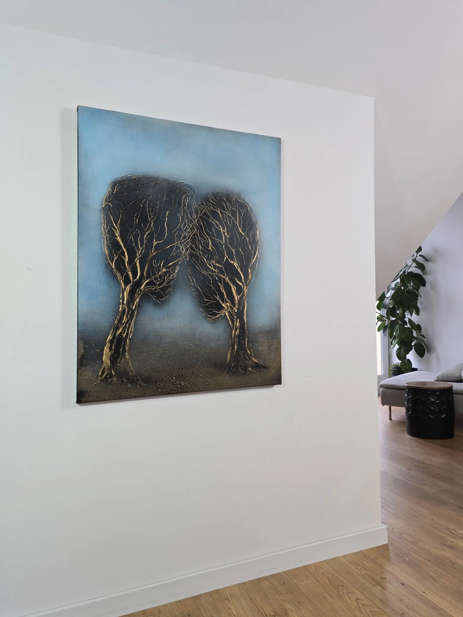 Ręcznie Malaowany obraz olejny na płótnie, wykonany w technice mixed-media z dodatkiem akryli. Spotkanie Dusz to obraz przepełniony symboliczną głębią, ukazujący dwa drzewa, które zdają się być w dialogu — ich korony splecione, jakby pochylały się ku sobie w cichej, intymnej rozmowie. Smukłe, złotawe gałęzie wyrastają z ciemnych pni, przeplatając się w misterny wzór, który przypomina układ żył czy dróg życia, które przypadkowo znalazły się w jednym, magicznym momencie.