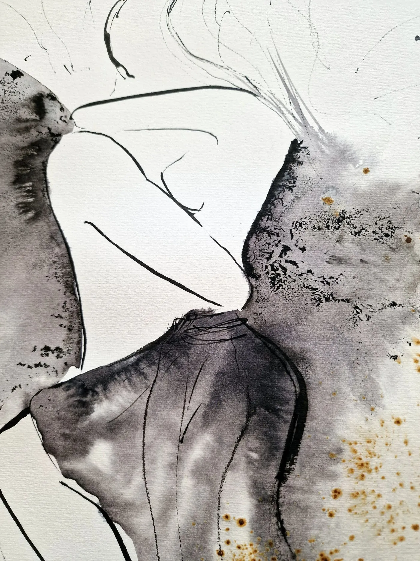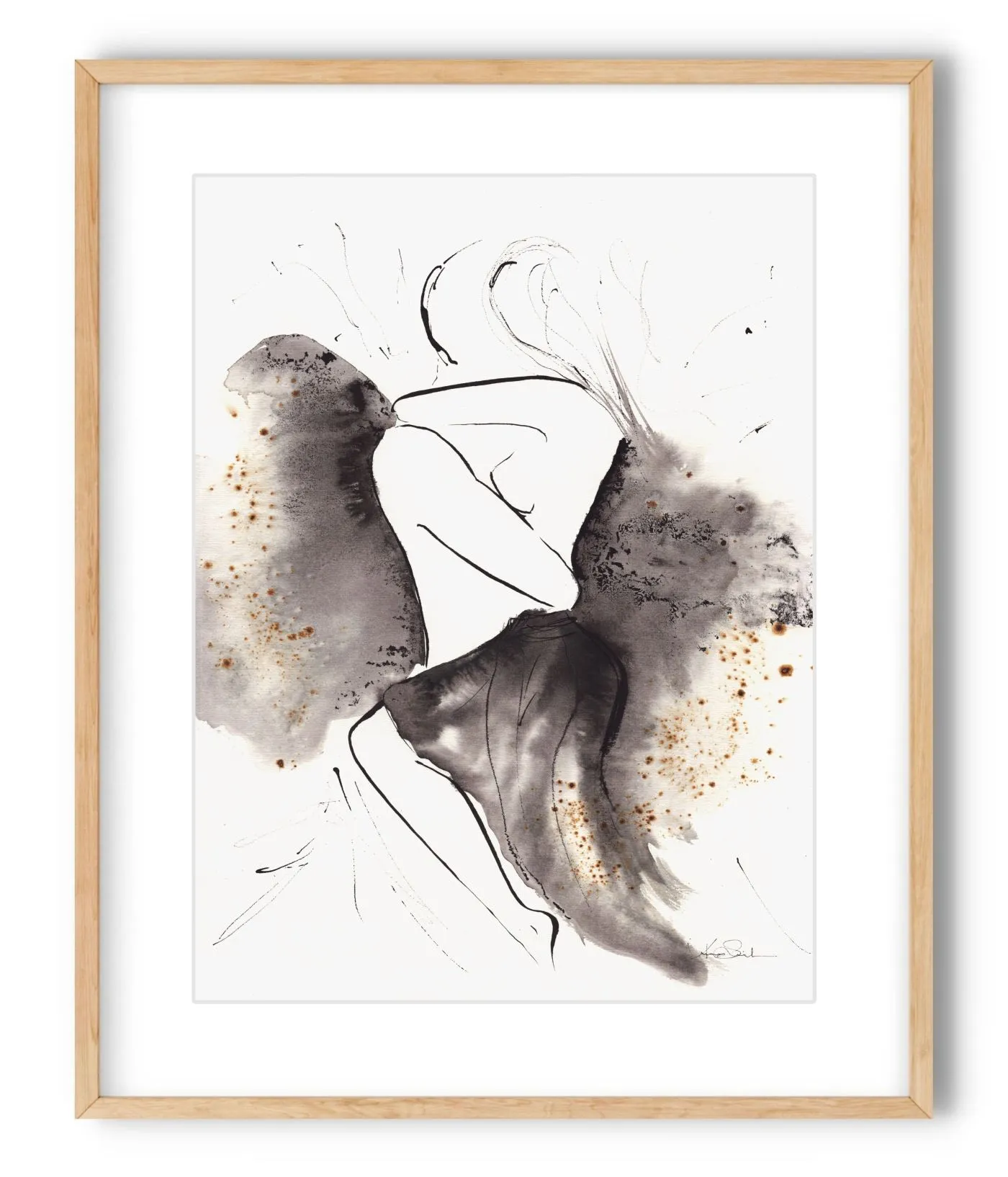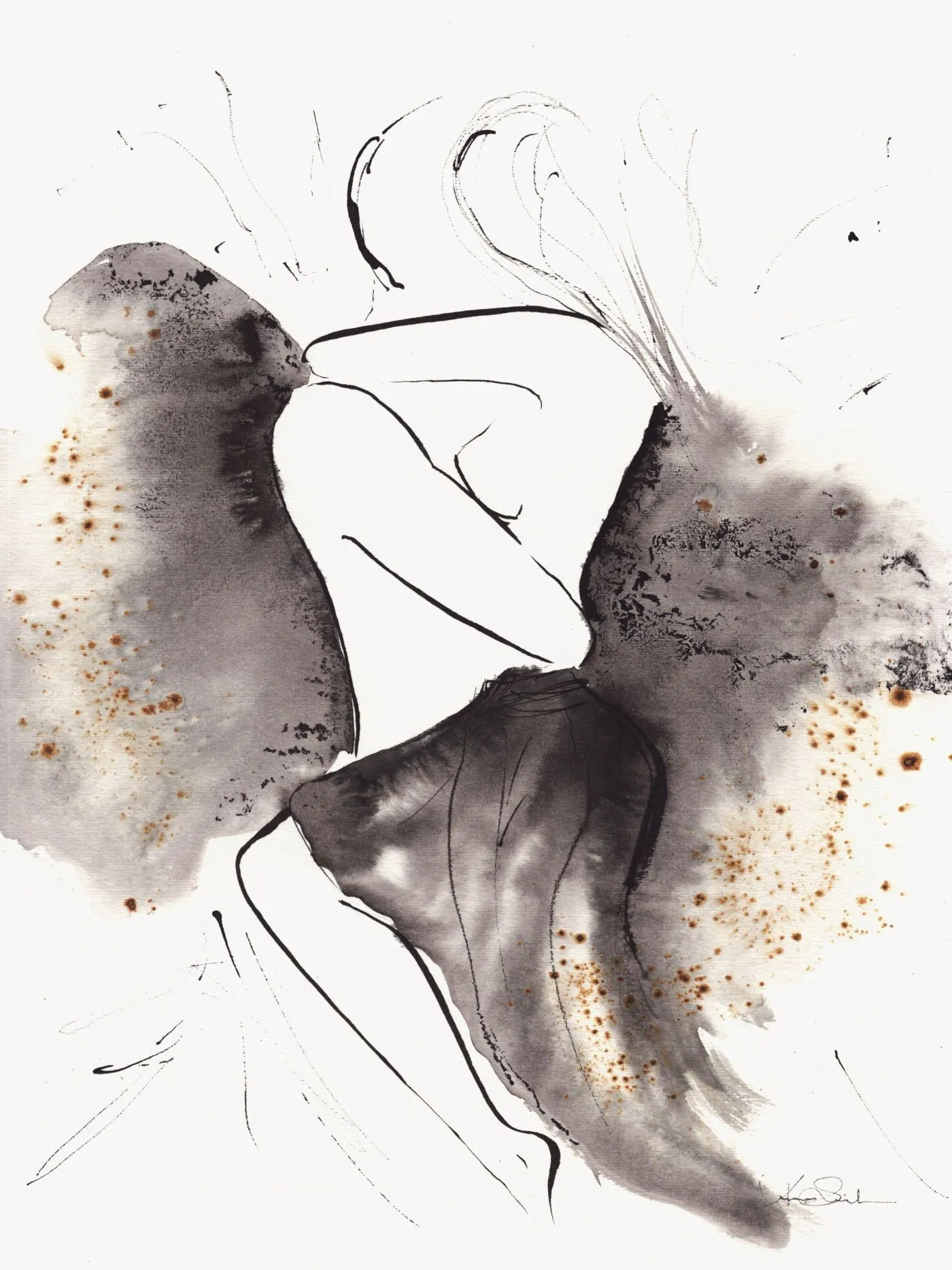 Praca o zmysłowym, wyciszonym charakterze łączy oszczędny rysunek aktu z miękką plamą akwareli i tuszu w odcieniach szarości, czerni oraz ciepłych, złamanych akcentów. Sylwetka pozostaje lekka i subtelna, a całość buduje elegancki, nowoczesny obraz o kobiecej miękkości.