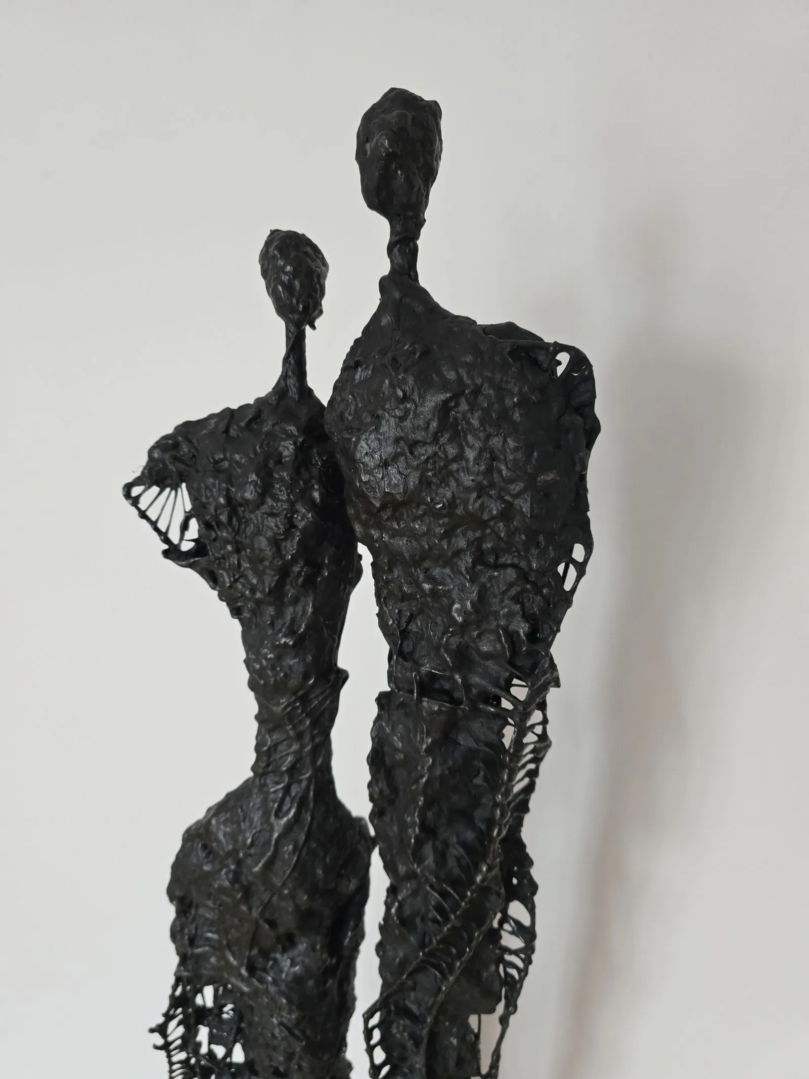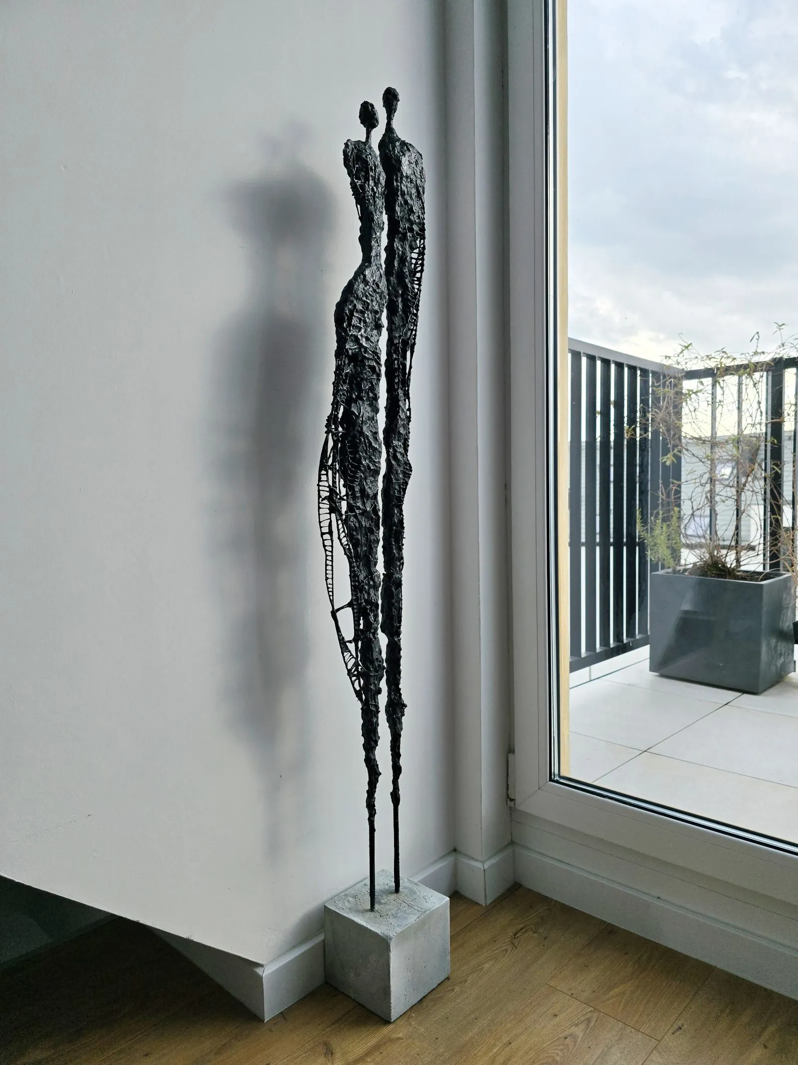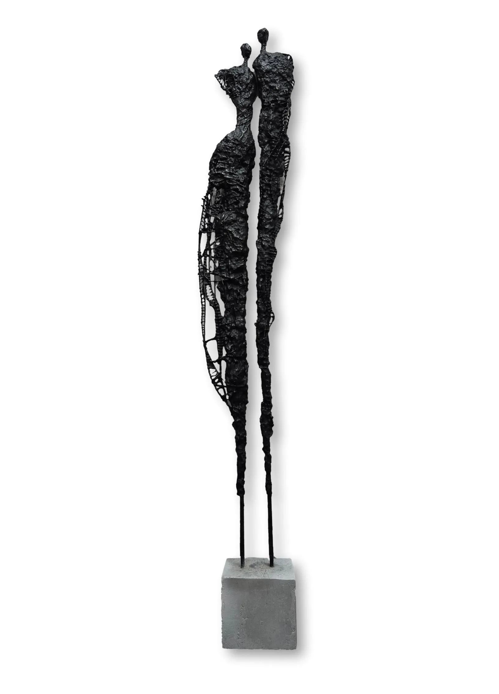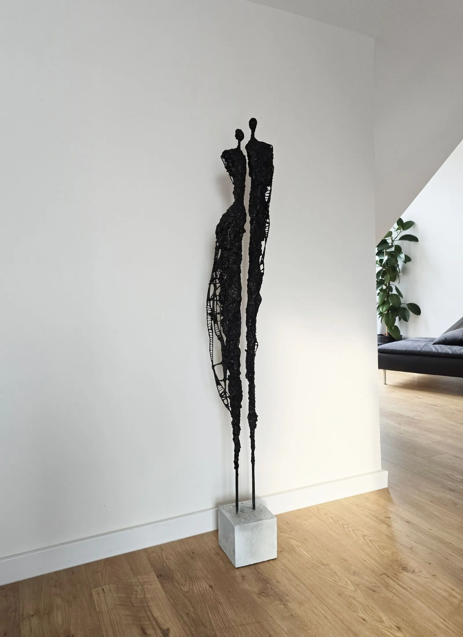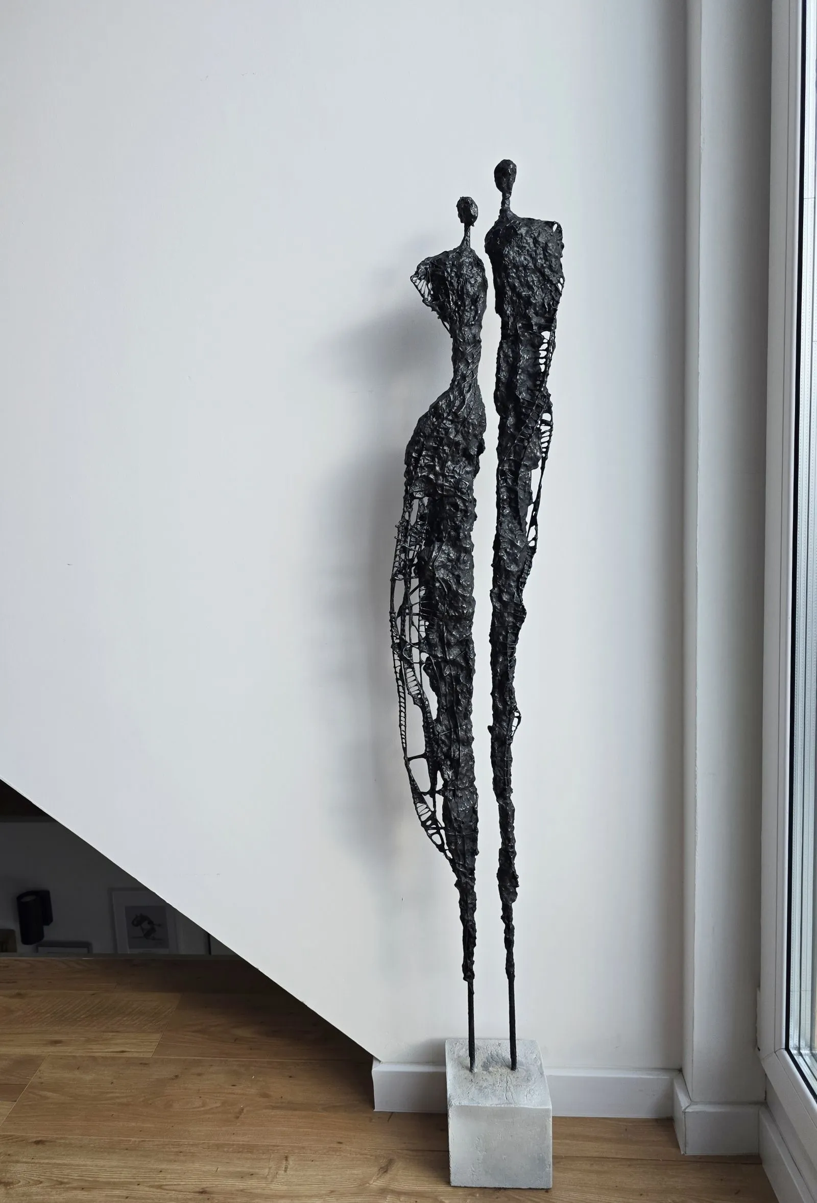 Inspiracją dla tego wyjątkowej rzeźby są obrazy i grafiki z mojej kolekcji Point od Balance. Zaczerpnięty z nich motyw kamiennych postaci, przeniesiony do formy przestrzennej, dodając rzeźbie głębi i znaczenia. Biomorficzne kształty rzeźby, nawiązujące do ludzkich sylwetek, wyrażają emocje i relacje, jakie łączą nas z innymi. Surowość materiałów została złagodzona przez plastyczność gliny i masy z sproszkowanego kamienia, tworząc harmonijną całość.