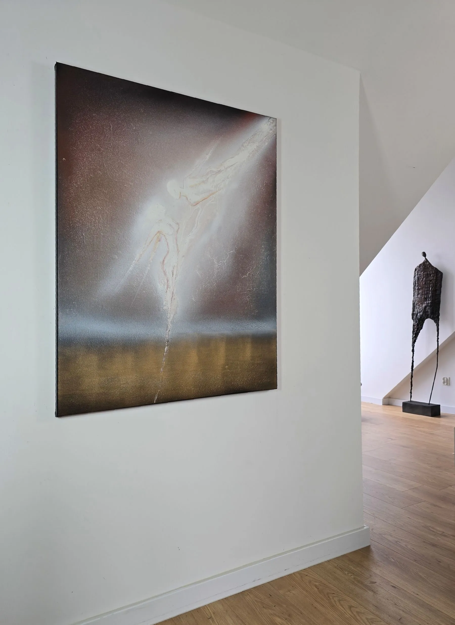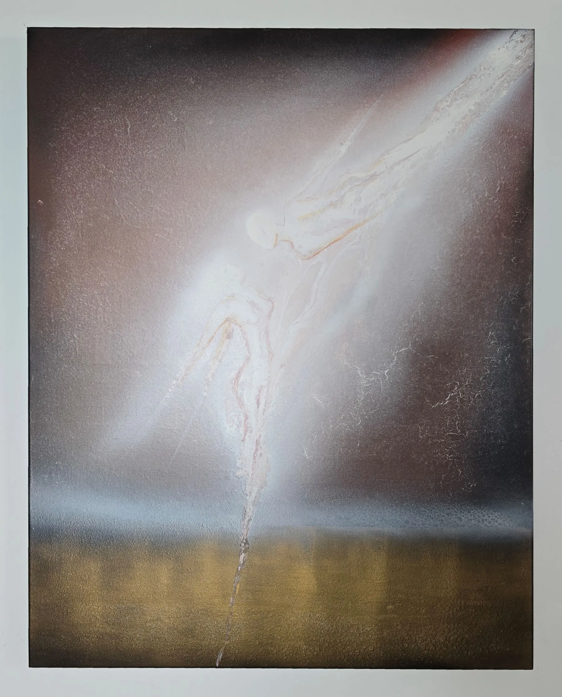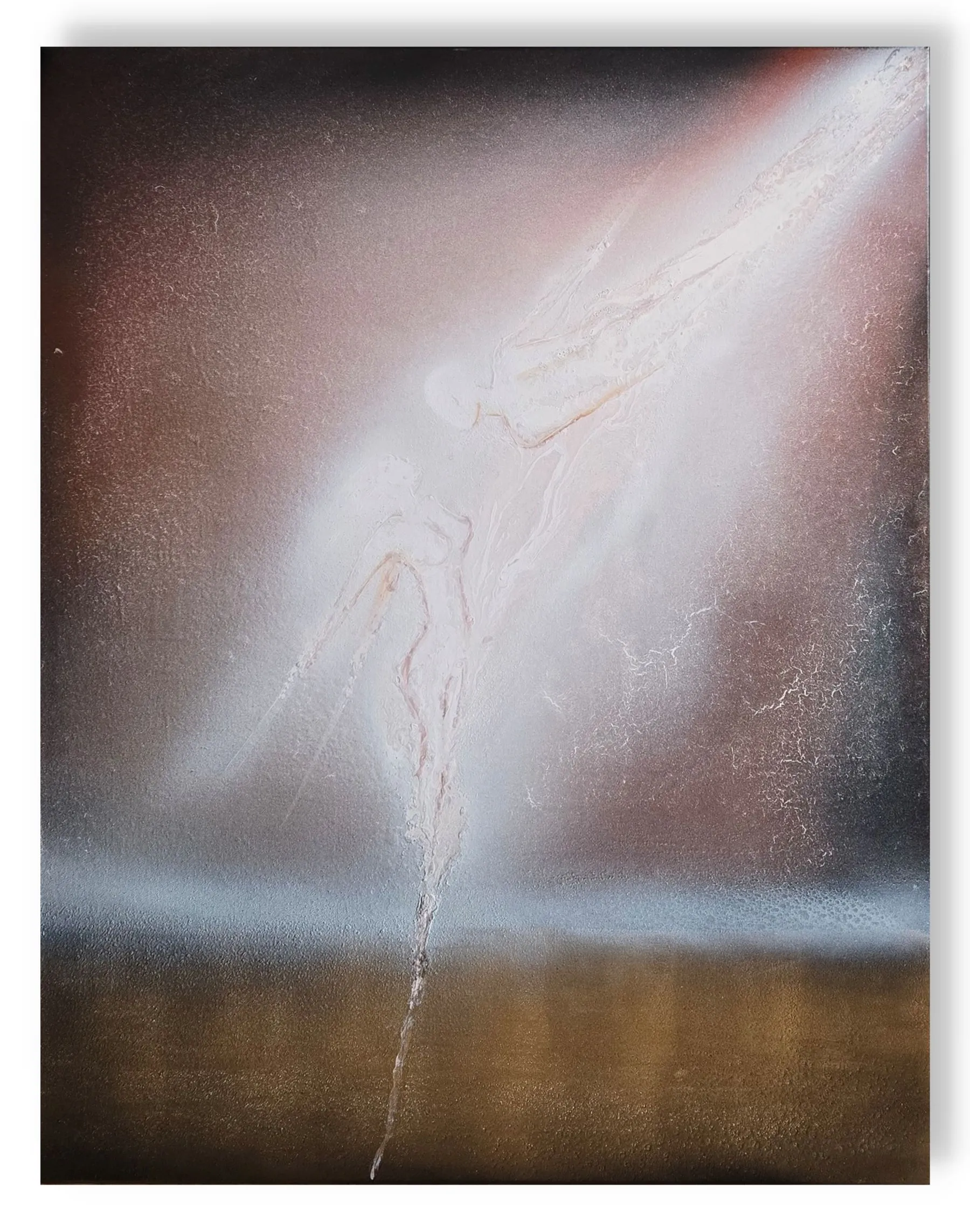 Z rozświetlonej, eterycznej smugi wyłaniają się subtelne postacie, jakby utkane z energii, światła i powietrza. Ich sylwetki unoszą się ku górze, stapiając z kosmiczną przestrzenią, a zarazem zakorzeniają w ziemskim tle.